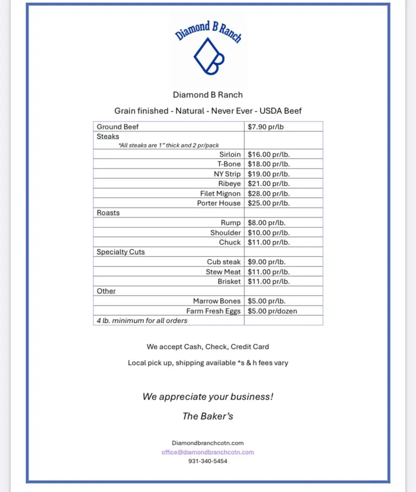 What is better than a stocked freezer full of locally raised beef? Your beef will come directly from Diamond B Ranch located in Middle Tennessee. The cattle are raised on lush, plentiful pastures and are finished on grain feed. Once they are the desired weight, they are brought into the processing plant where they will dry-age for 21 days. Dry aging is a process where the meat hangs, allowing for drip loss and for enzymes to break down fibers. This creates a more tender and flavorful piece of meat.